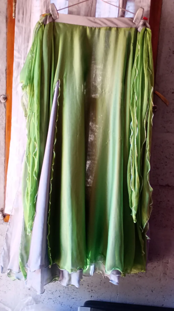 Pollera larga de seda verde con detalles de lentejuelas plateadas en los bordes de los volados. Posee una abertura lateral.