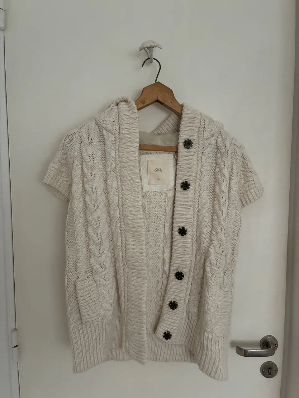 Cardigan tejido color crudo, con botones y capucha. Ideal para un look comfy y casual.