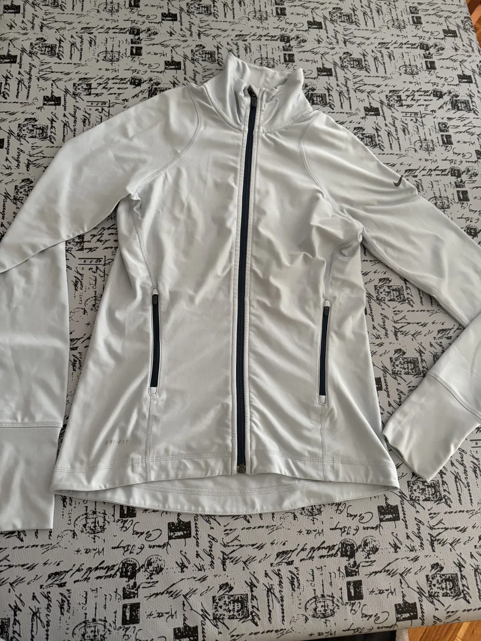 Campera deportiva celeste con cierre completo y cuello alto. Posee bolsillos laterales con cierre y puños con ojal para pulgar.