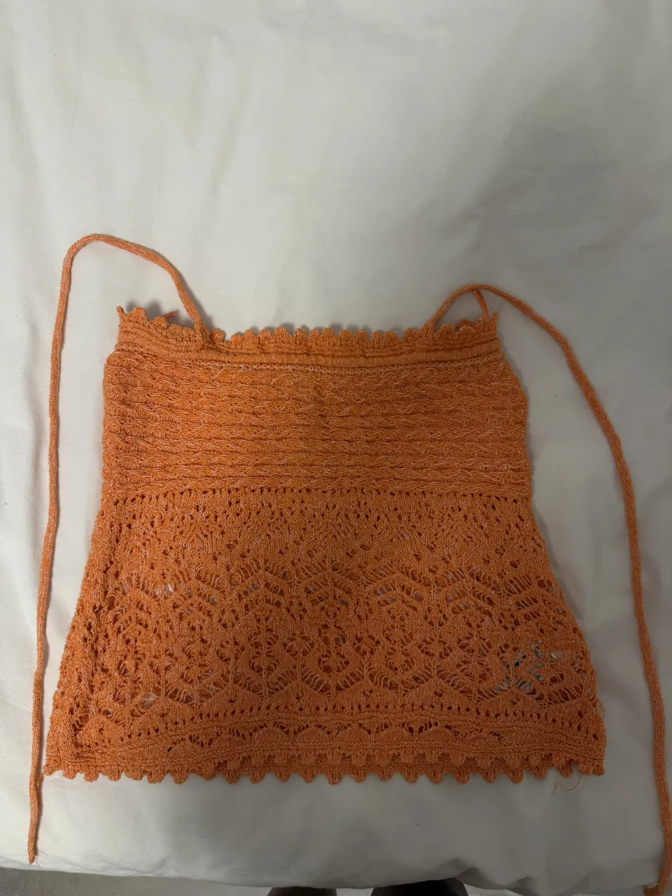 Top tejido naranja con detalles de crochet y tiras para atar.