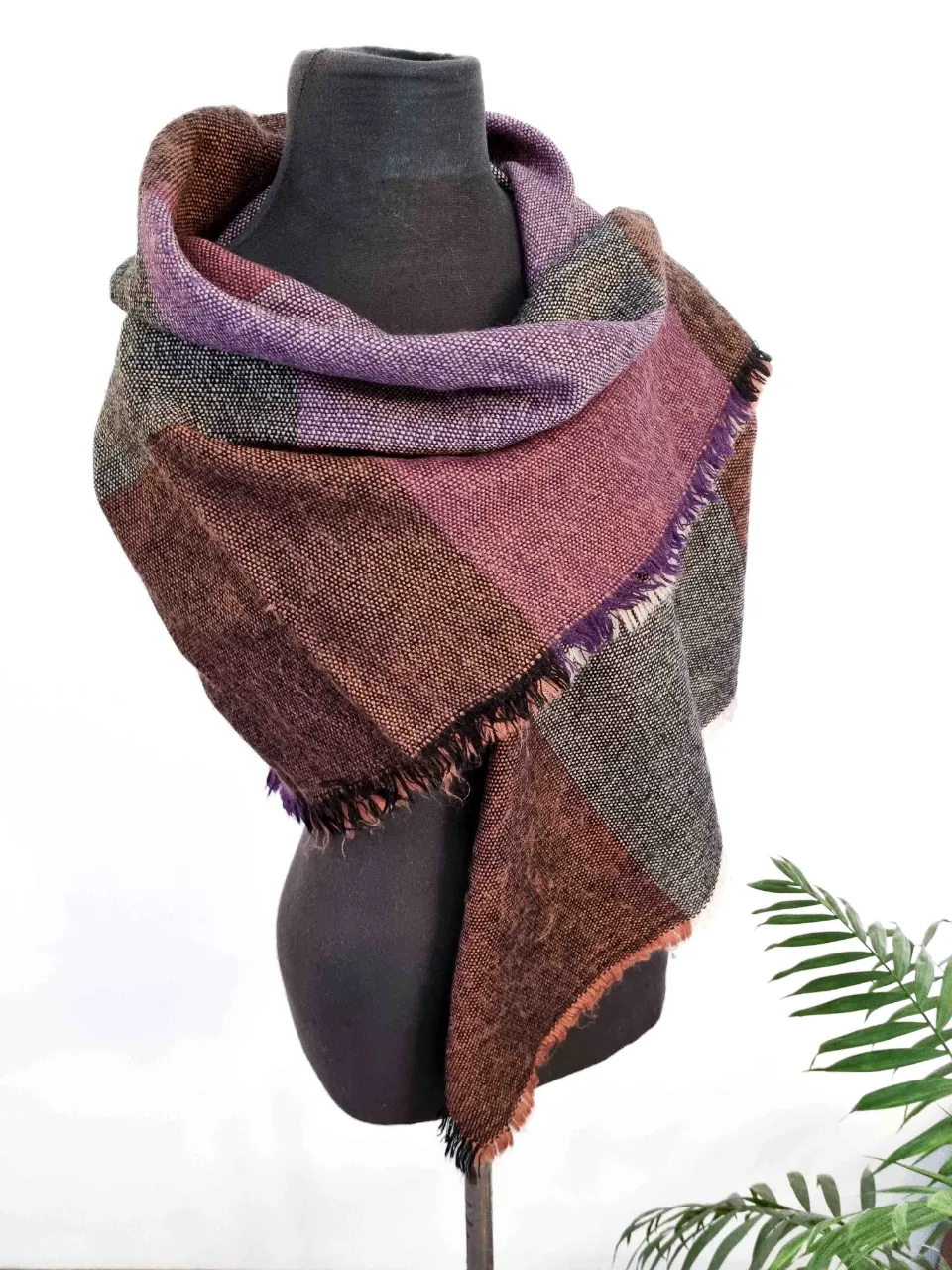 Bufanda de tejido a cuadros en tonos tierra y lilas. Posee flecos en los bordes. Medida 120x120 cm.