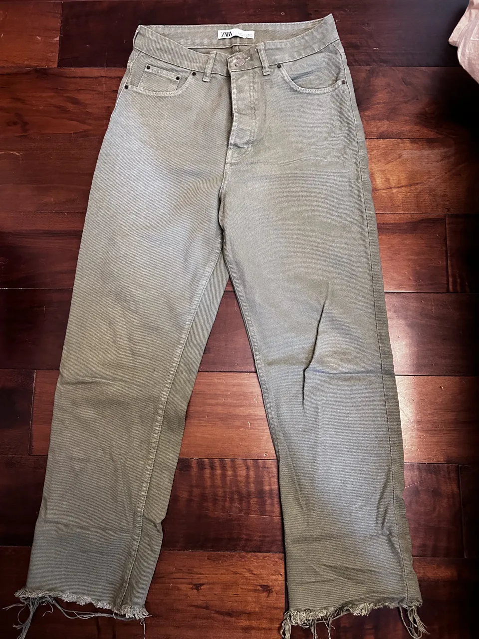 Jean de tiro alto con botones y roturas en los bajos. Color verde militar.