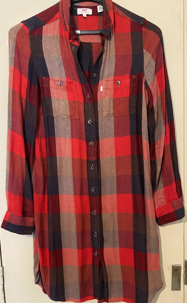 Camisa a cuadros de manga larga, con botones al frente y dos bolsillos en el pecho. La prenda es larga y tiene un cuello tipo camisa.