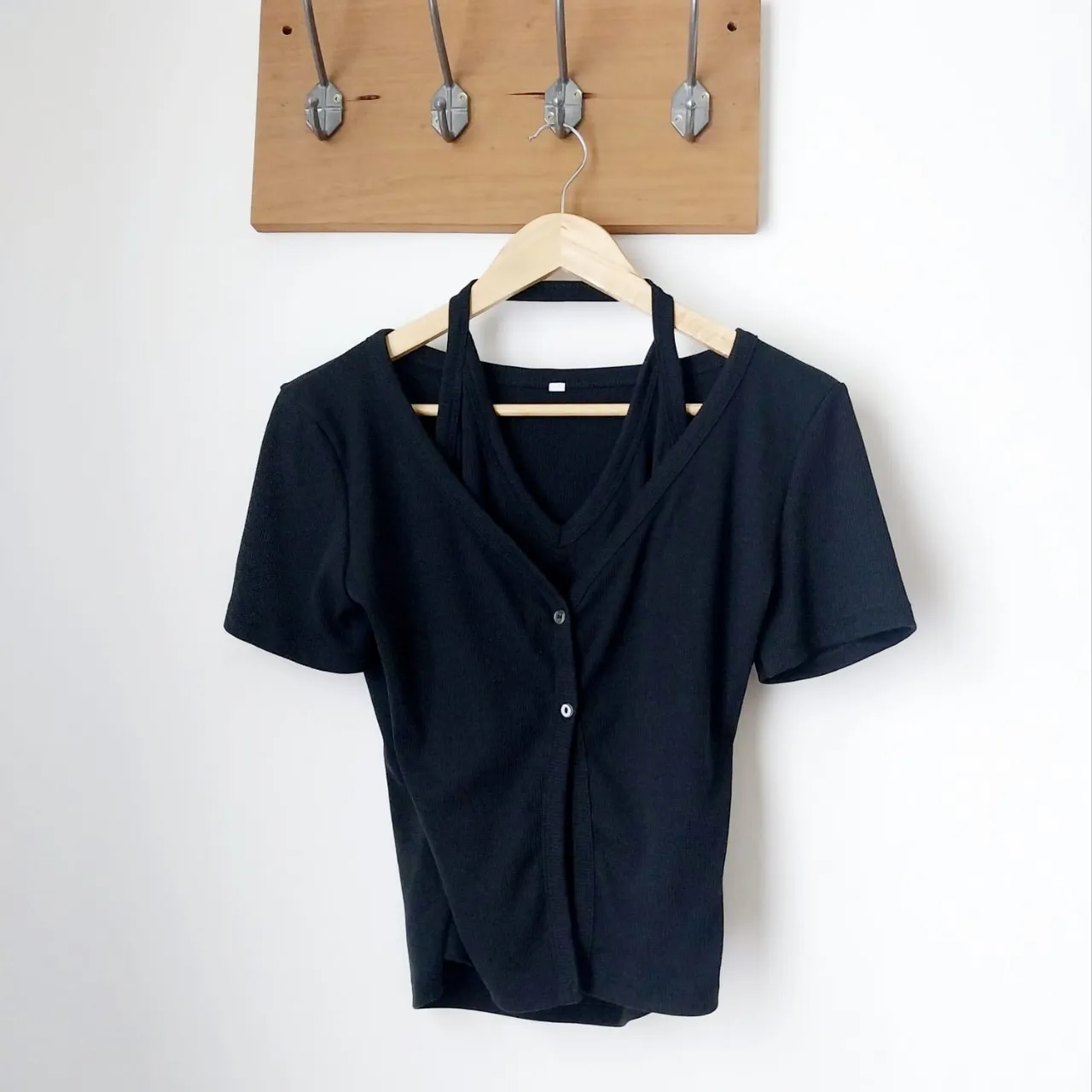 Remera Top negra de manga corta con escote en V y detalle de tiras cruzadas en el cuello. Posee botones al frente y un corte moderno. Hasta 90 de busto.