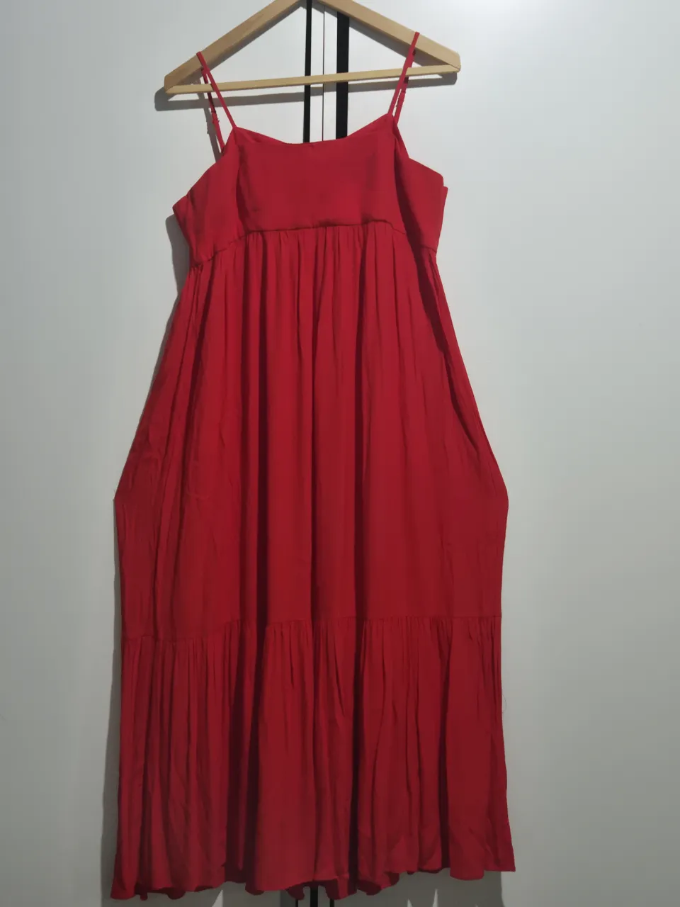 Vestido rojo largo con tiras finas y falda con volados. Ideal para un look fresco y femenino.