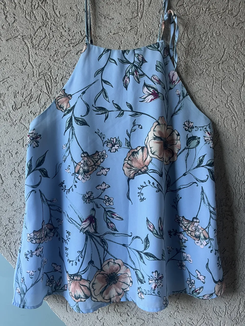 Blusa celeste pastel con estampa floral en tonos rosas y verdes pastel. Ideal para un look fresco y femenino.