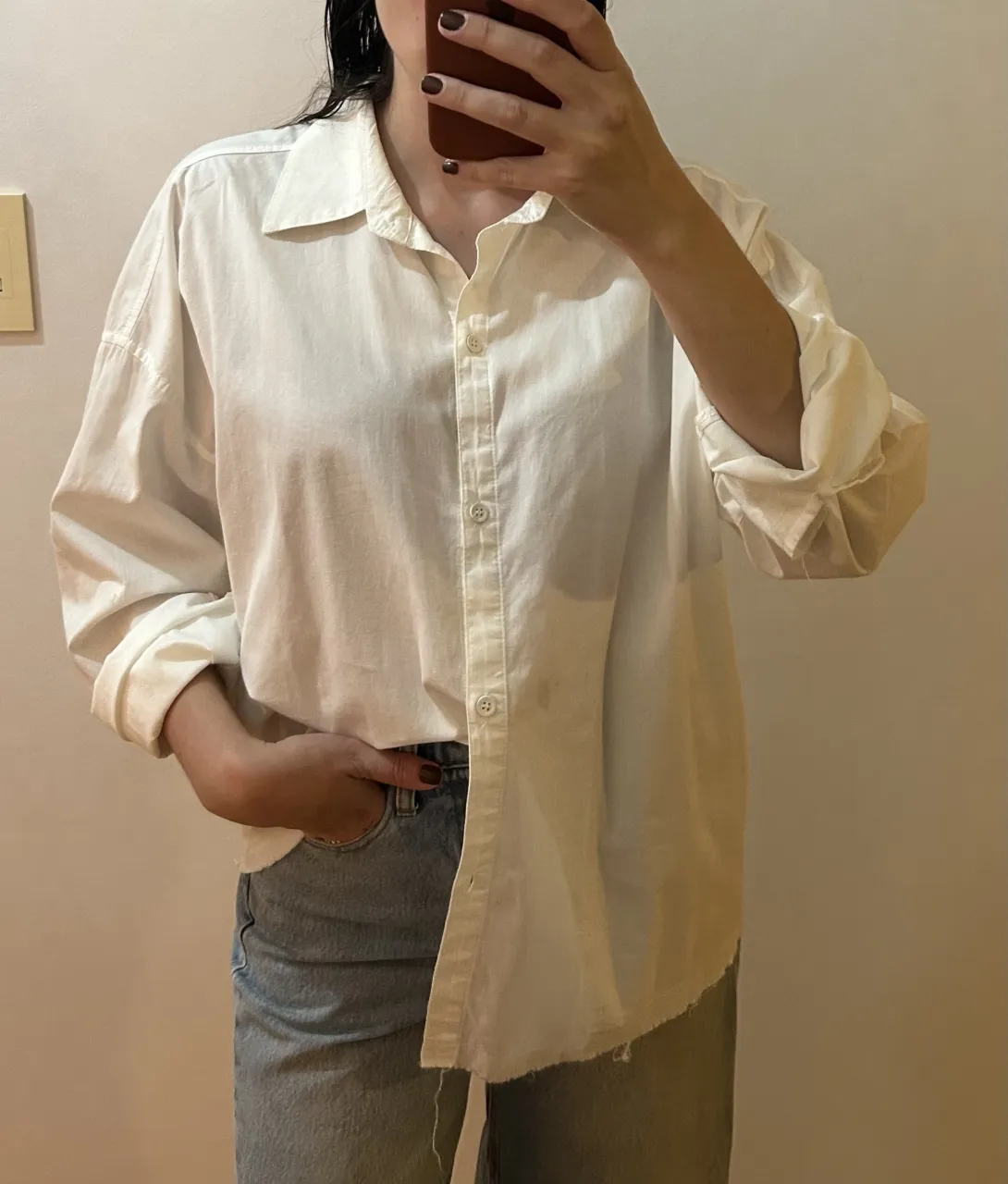 Camisa blanca de manga larga con botones al frente. Posee cuello clásico y puños en las mangas. El bajo de la prenda es desflecado. Tiene un solo uso. Talle S over/M