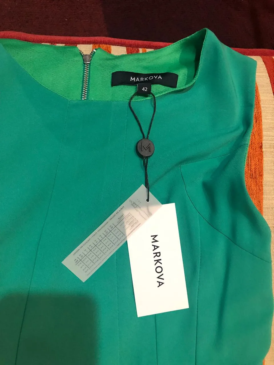 Vestido verde esmeralda, sin mangas y con un corte A que se abre desde la cintura. Posee un cierre metálico en la espalda y detalles de pliegues en la falda que le dan movimiento. Ideal para un evento o una salida elegante.