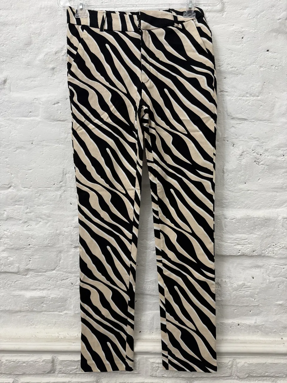 Pantalón Las Oreiro de vestir tiro alto con estampa de cebra en blanco y negro. Diseño ajustado y elegante, ideal para un look canchero y moderno.