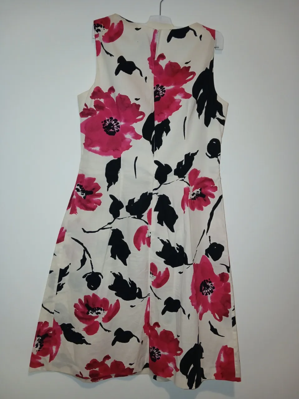 Vestido blanco con estampa floral en fucsia y negro. Diseño sin mangas y corte A, ideal para un look fresco y femenino. Perfecto para eventos de día o salidas casuales.