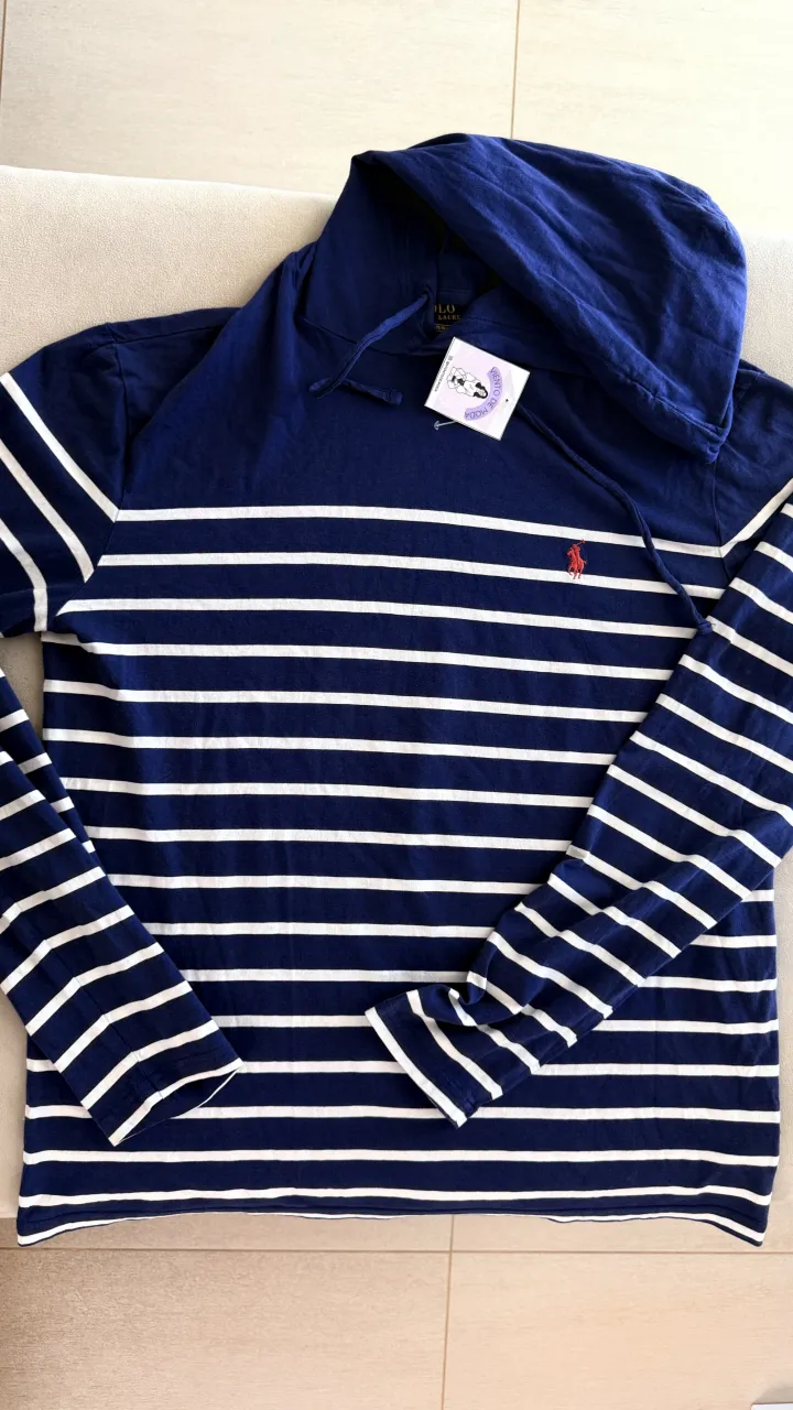 Buzo con capucha, color azul con rayas blancas y con capucha y cordones. Logo rojo bordado en el frente. Es finito. Medidas: hombros 47, sisa 55, largo 67, mangas 65