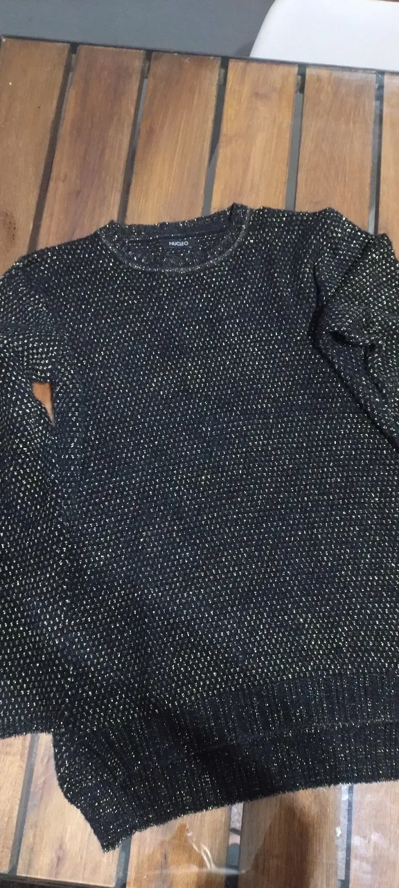 Sweater negro con hilos dorados entretejidos. Cuello redondo y mangas largas. Largo 72 cm, sisa 52 cm, tiene un pequeño enganche en la manga