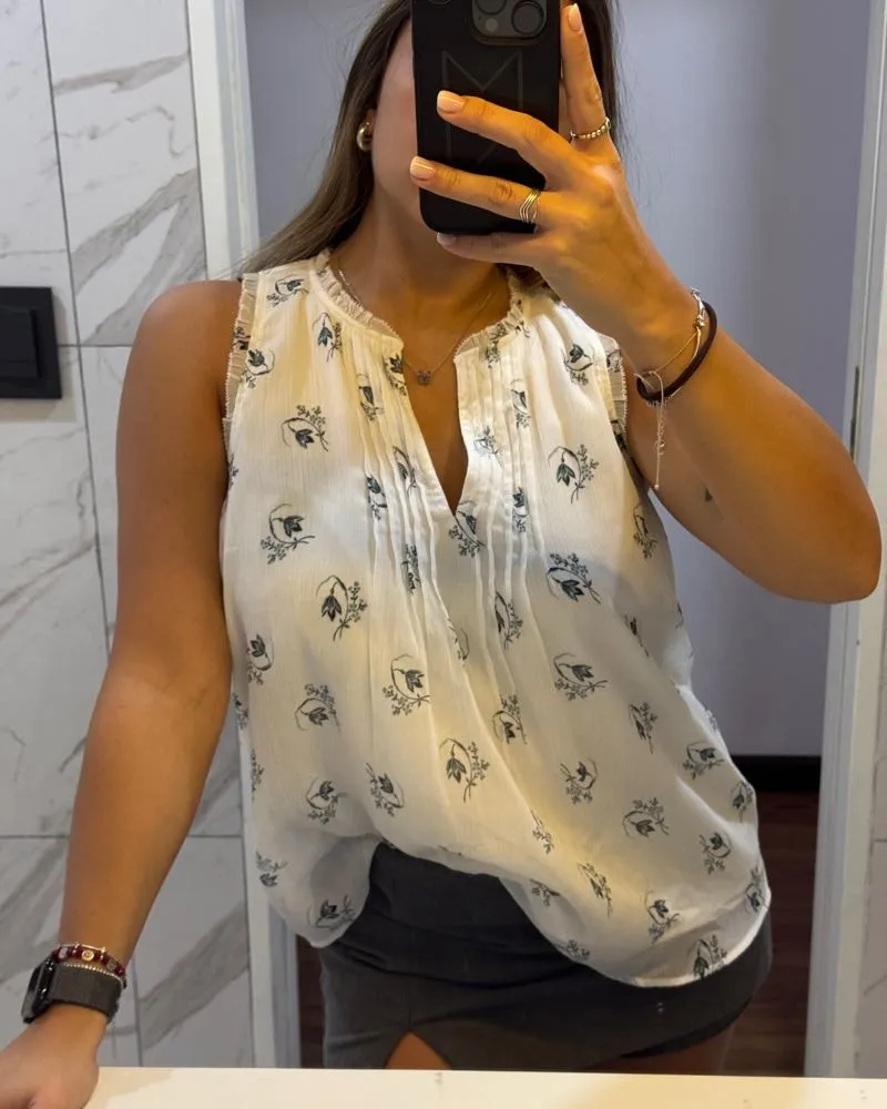 Remera blanca sin mangas con estampa floral en tonos azules y verdes. Posee cuello en V con detalle de frunces y terminación de volado en el cuello.