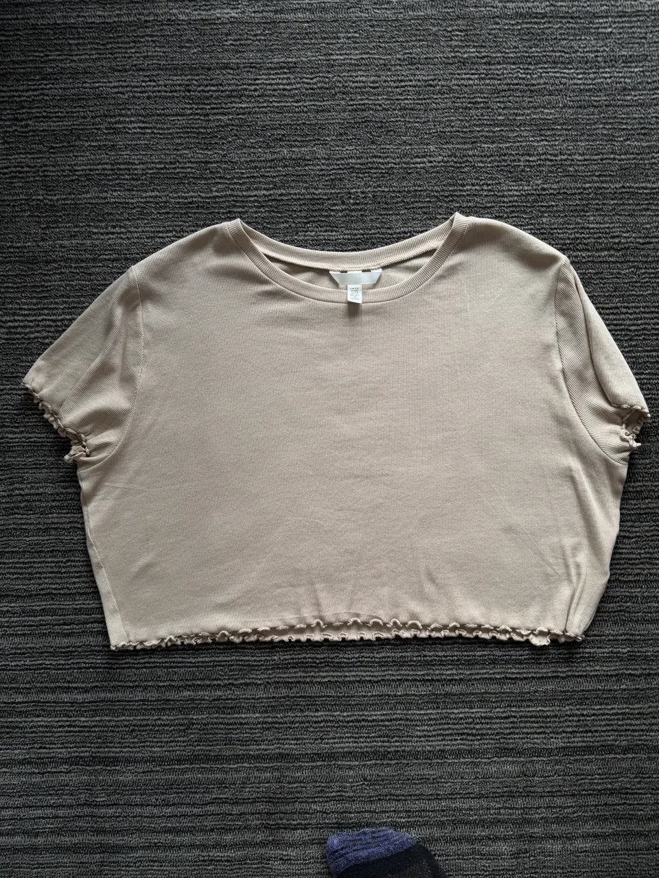Remera crop de algodón acanalado, con mangas cortas y terminaciones con volados. Ideal para un look casual y moderno.