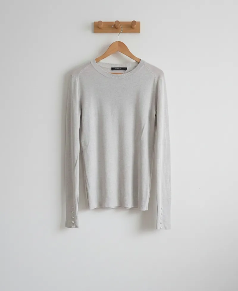 Sweater gris claro de manga larga con cuello redondo. Detalle de botones nacarados en los puños. Ideal para un look casual y elegante.