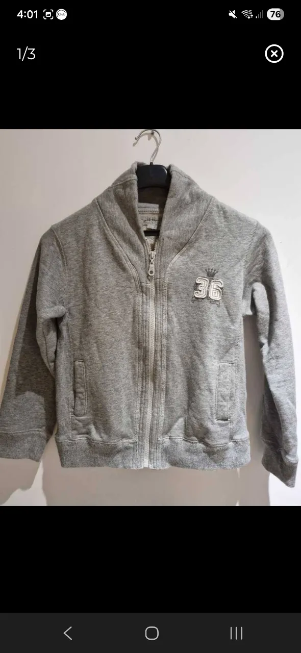 Buzo gris con cierre completo y cuello alto. Tiene un bordado con el número 36 y una corona en el frente. Ideal para un look casual y cómodo.