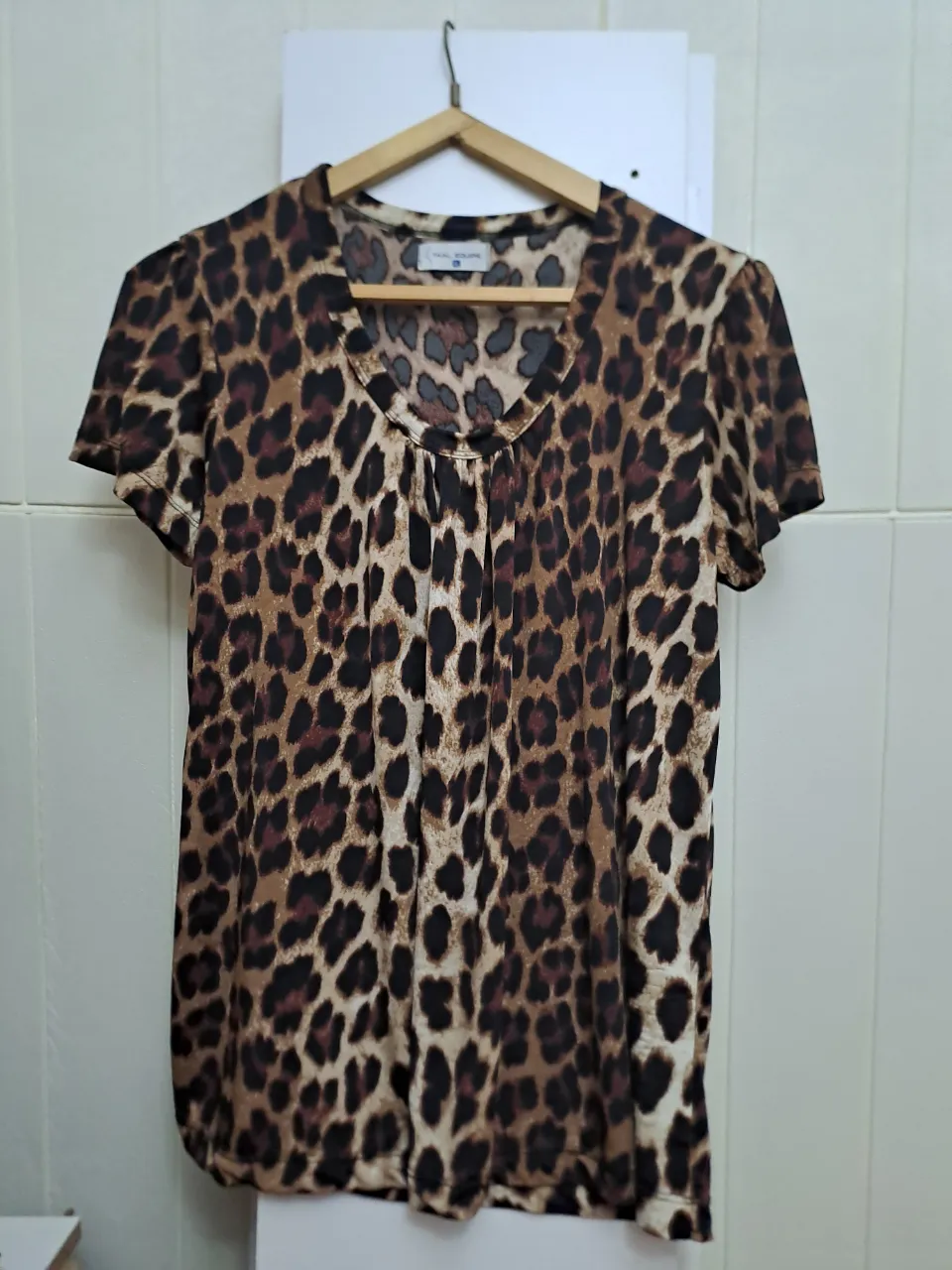 Remera de manga corta con estampa de leopardo. Posee cuello redondo con detalle de frunces.