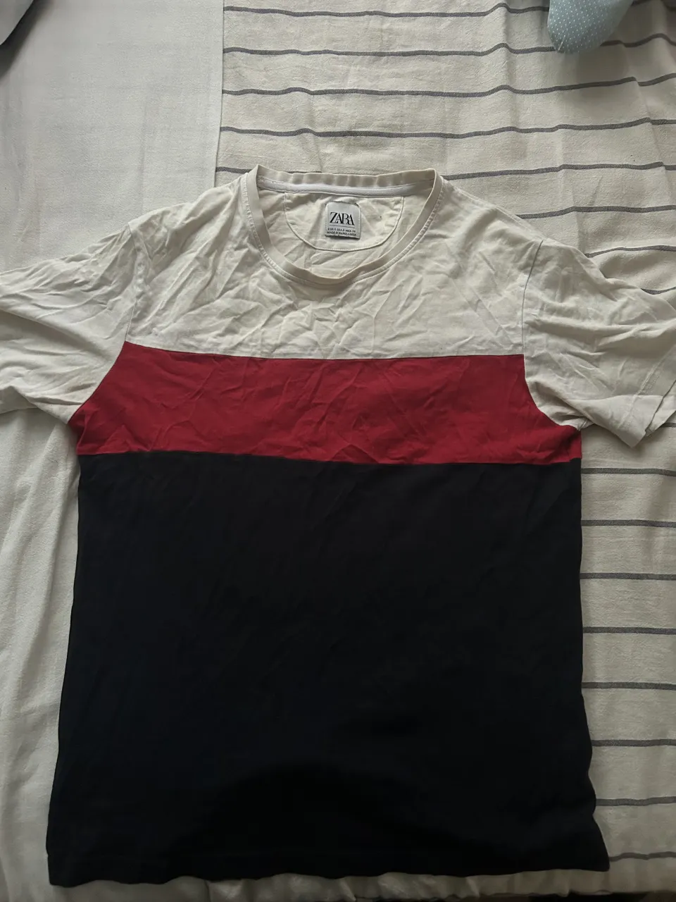 Remera de algodón con bloques de color. La parte superior es blanca, seguida de una franja roja y la parte inferior es negra. la parte blanca esta un poco percudida