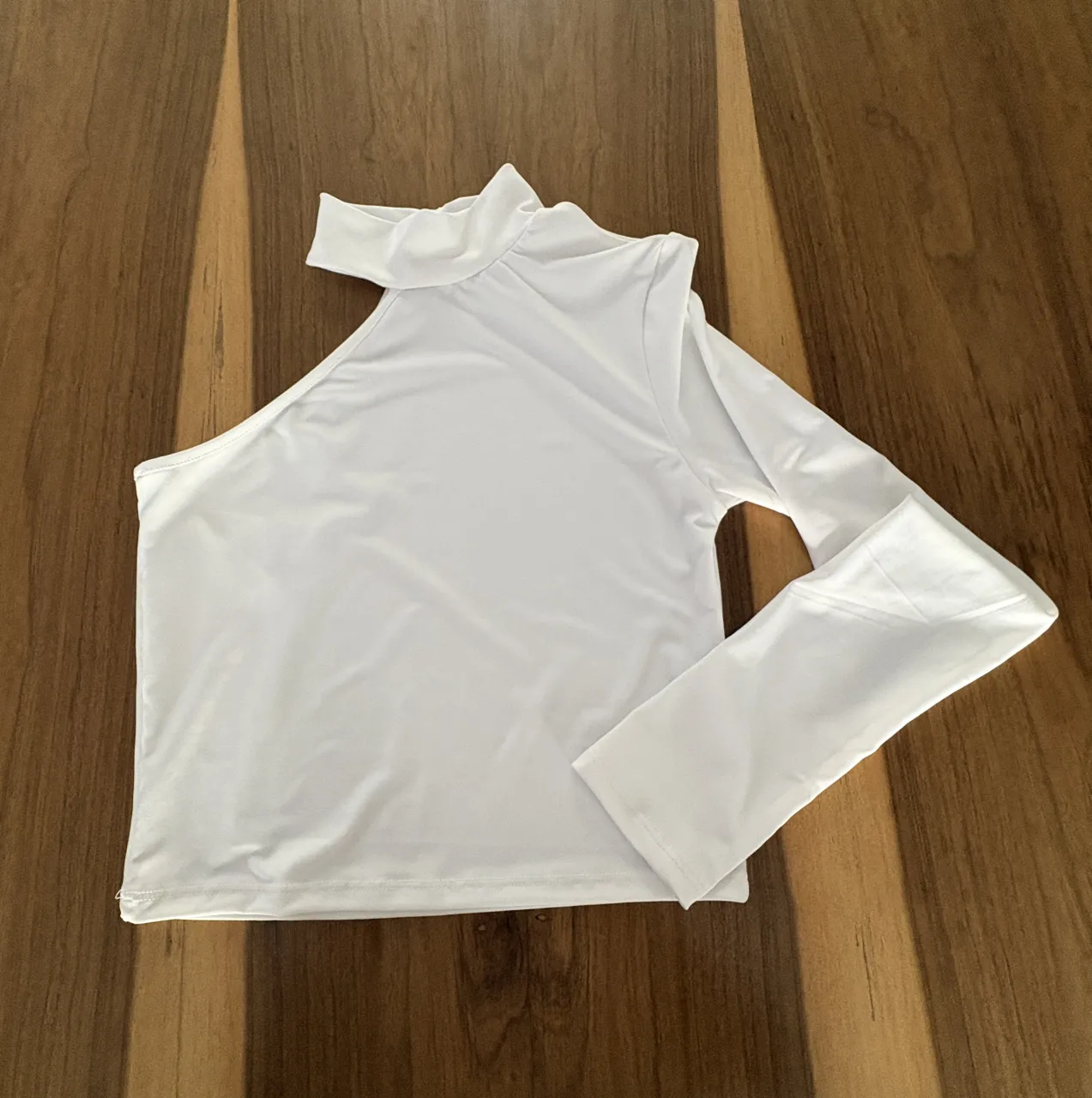 Remera blanca con cuello alto y un solo hombro descubierto. Manga larga.