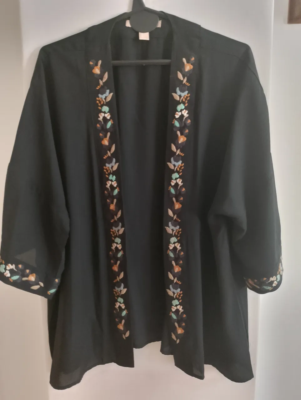 Kimono negro con bordados florales en los bordes y mangas. Ideal para darle un toque bohemio y chic a cualquier outfit.