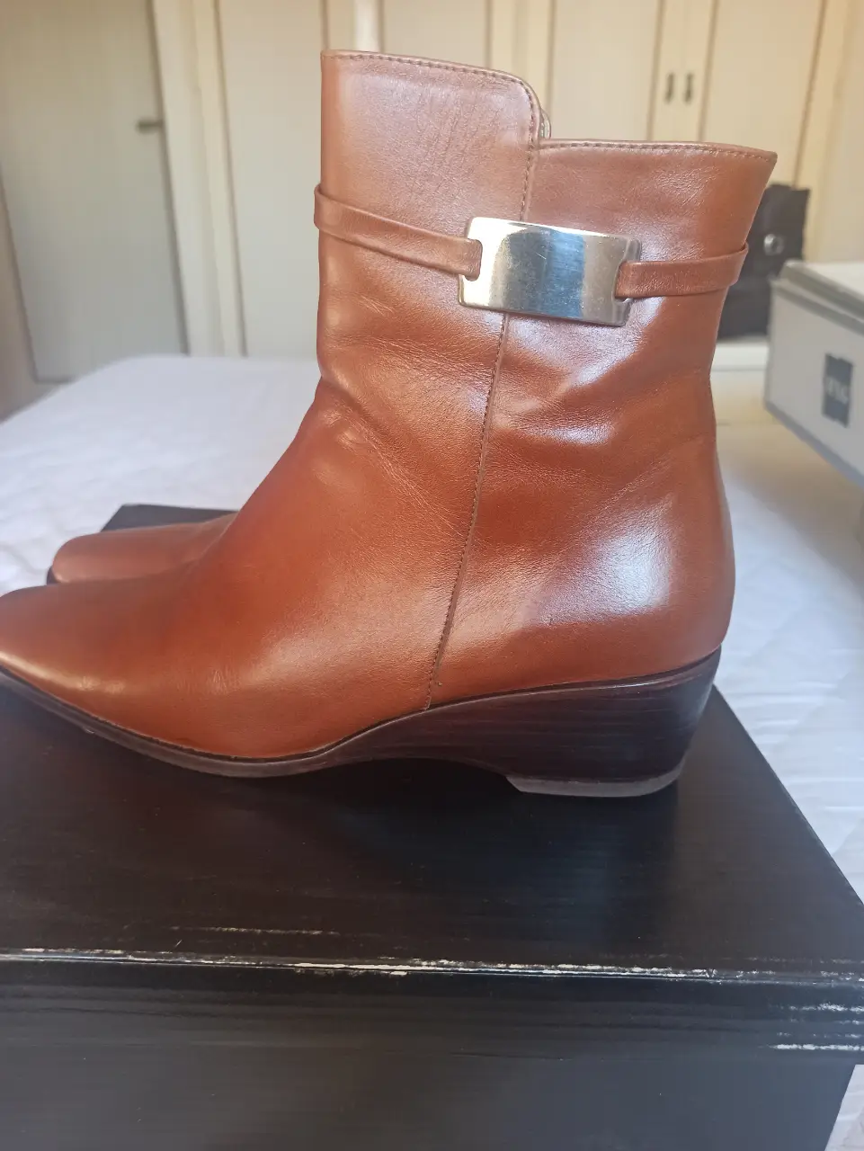 Botines de cuero marrón con detalle de hebilla plateada. Ideales para un look elegante y cómodo.