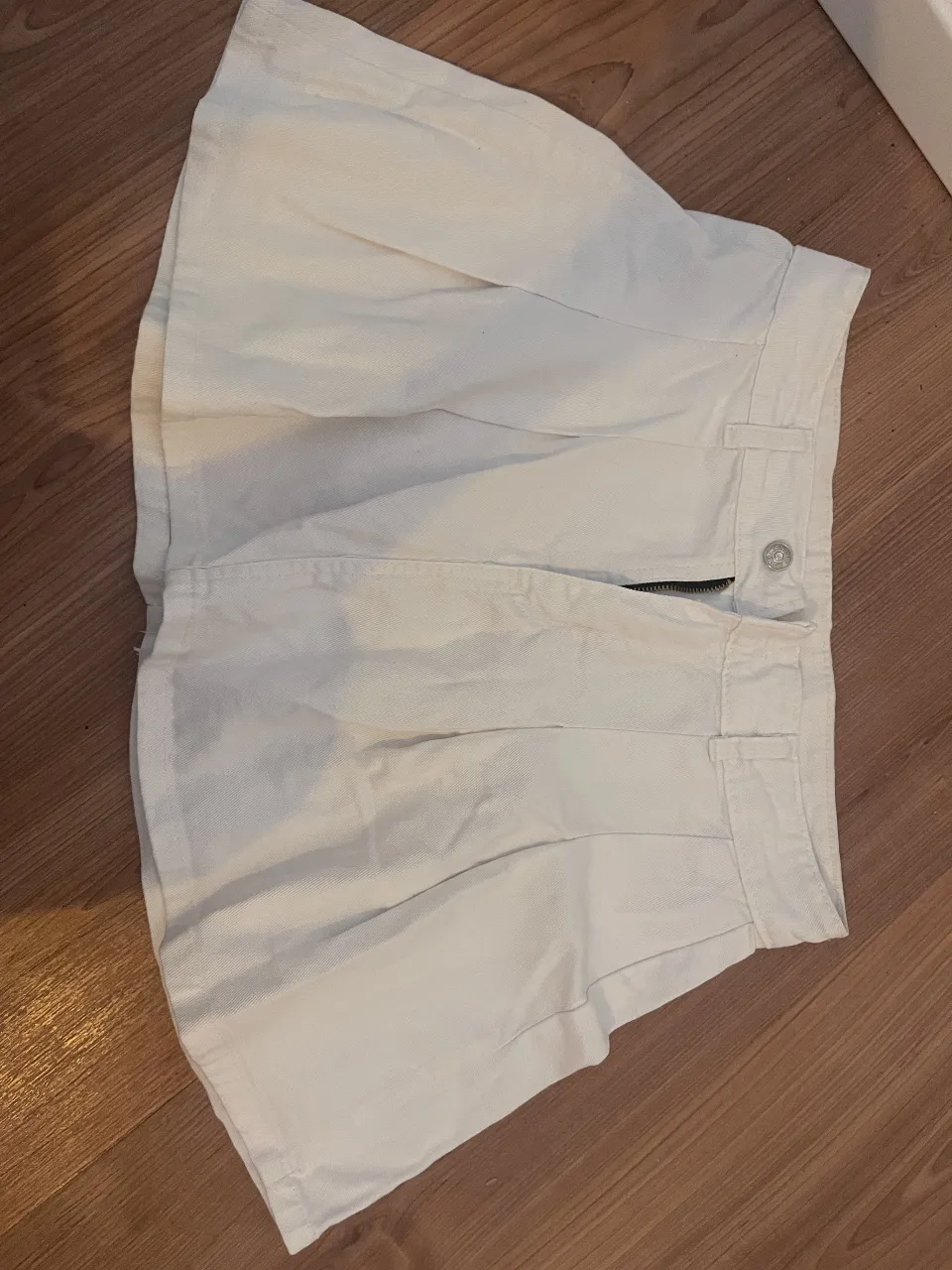 Pollera blanca de jean, tiro alto, con detalles de pliegues y cierre metálico. Ideal para un look casual y fresco.