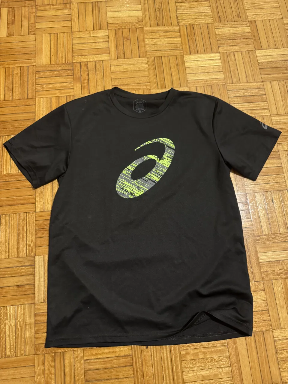 Remera deportiva negra con logo de Asics en gris y verde lima. Ideal para entrenamientos y actividades al aire libre.