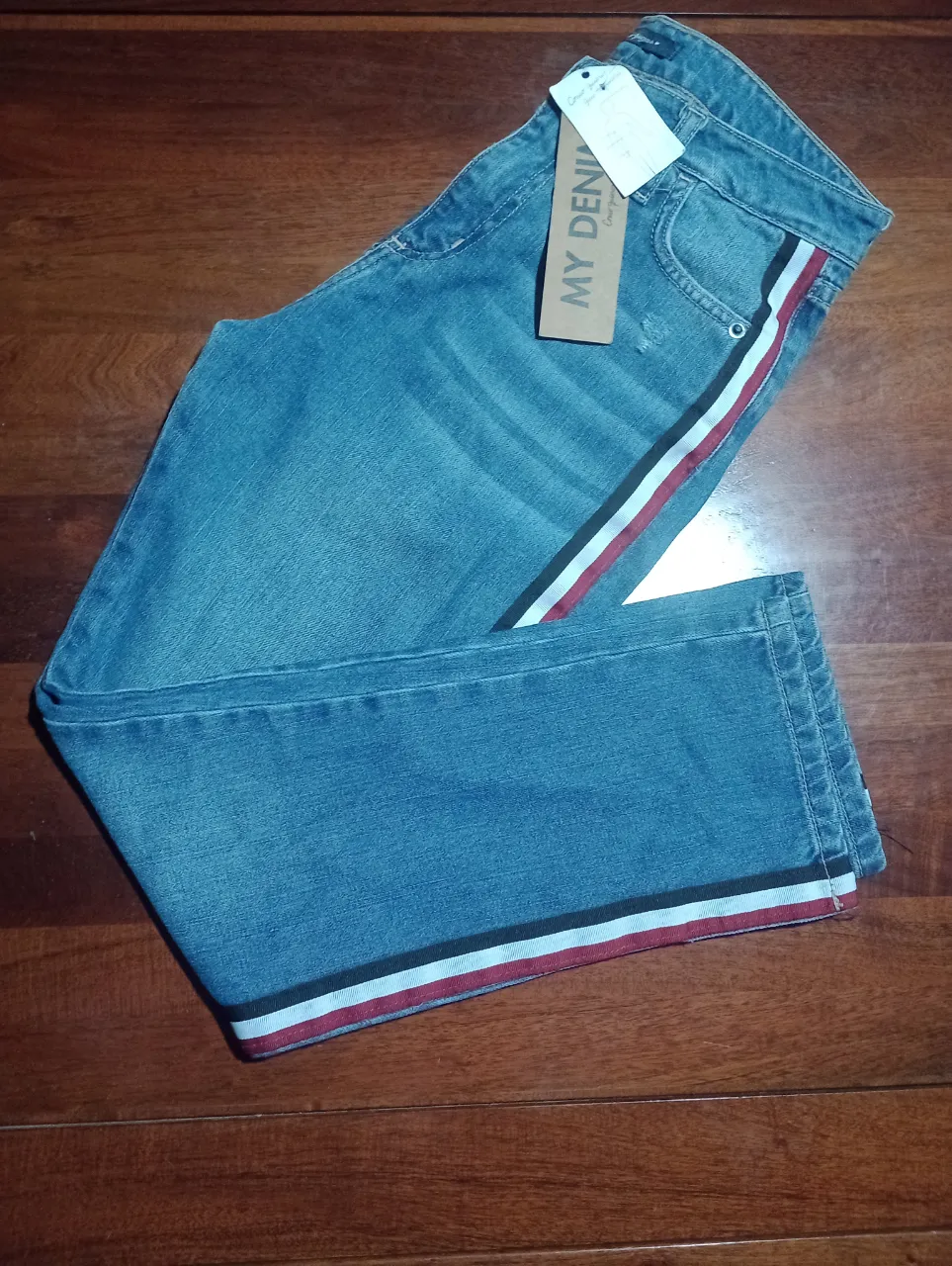 Jeans tiro alto con detalles de franjas laterales en rojo, blanco y negro. Un toque deportivo y moderno para tu look.