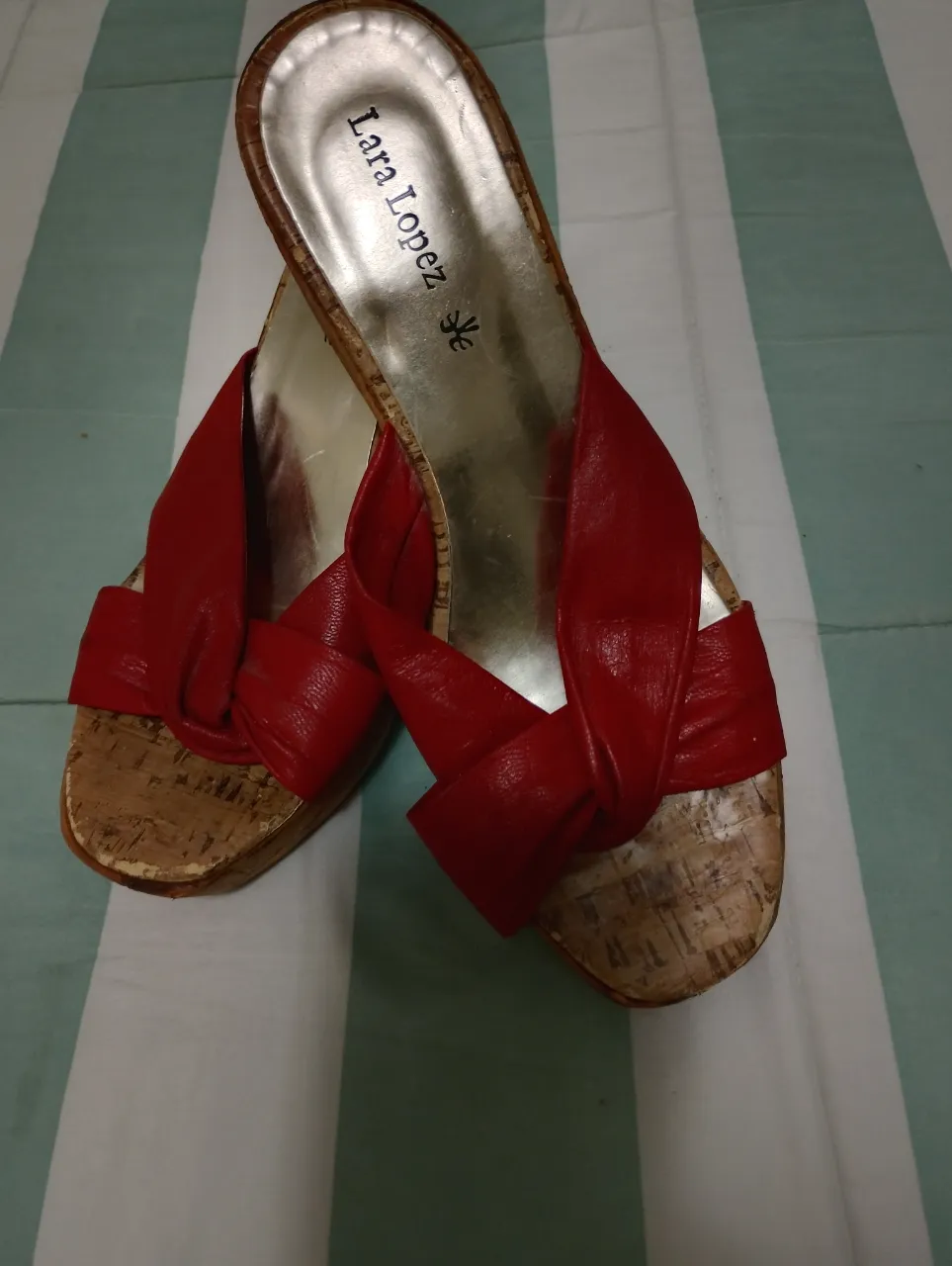 Sandalias de taco cuña color rojo con tiras cruzadas en el empeine. La base es de corcho.