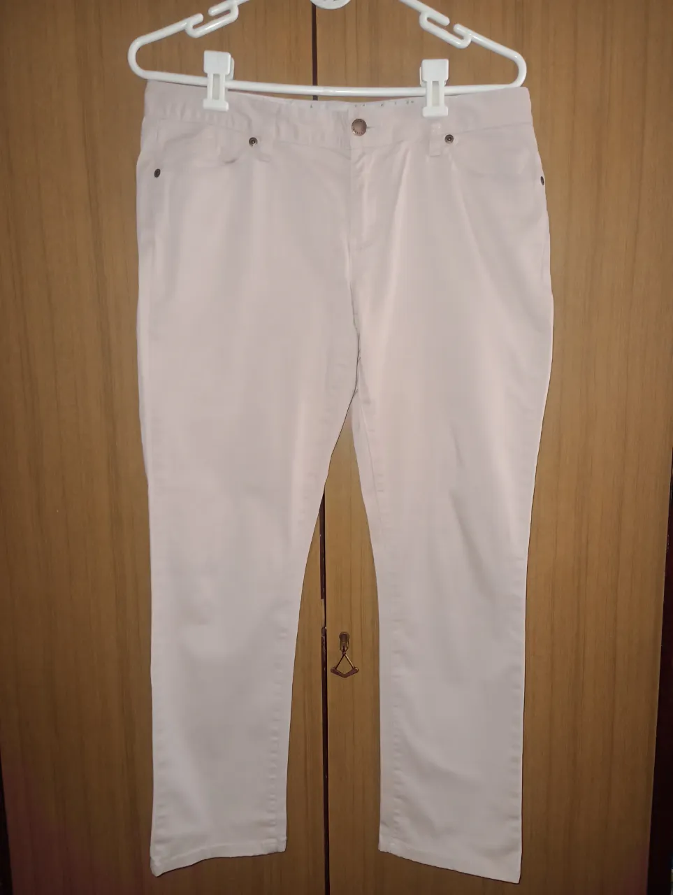 Pantalón de gabardina color crudo, tiro alto, con bolsillos y detalles de costura. Ideal para un look casual y cómodo.