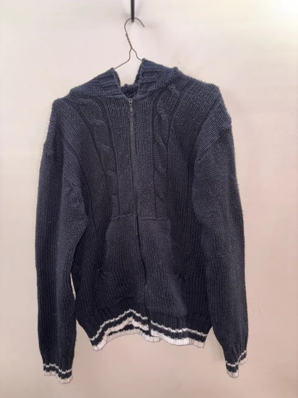 Buzo de tejido grueso con capucha y cierre completo. Posee bolsillos frontales y detalles de ribb a rayas en puños y cintura.