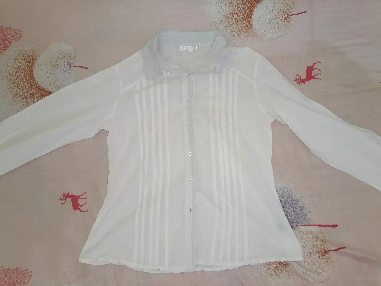 Camisa blanca de manga larga con detalles de frunces verticales en el frente.