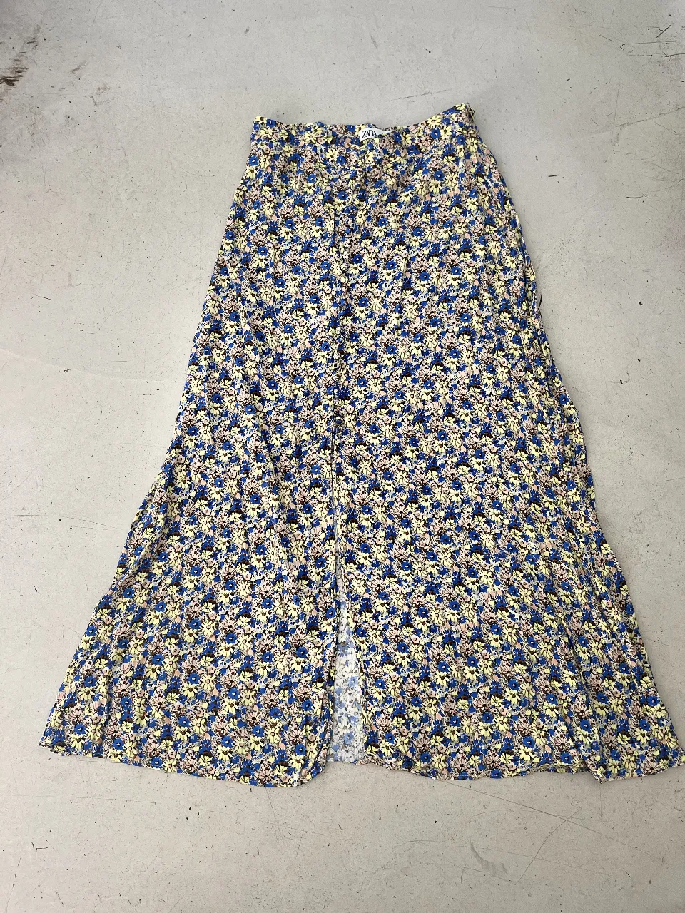 Pollera larga estampada con flores pequeñas en tonos amarillos, azules y rosas. Posee botones en la parte delantera y una abertura. Ideal para un look fresco y femenino.