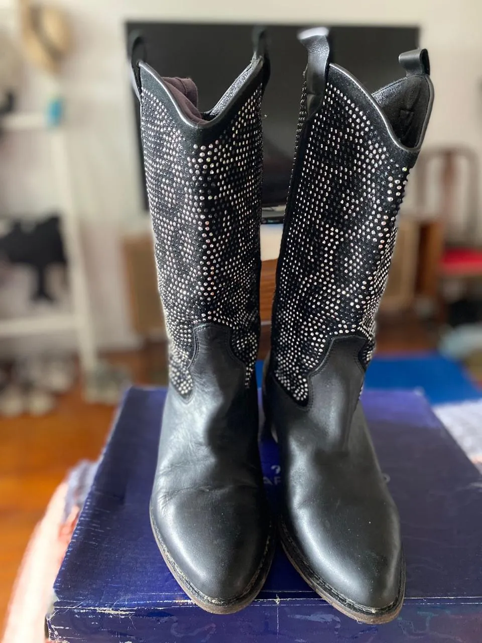 Botas de cuero negras con tachas plateadas, estilo cowboy. Un diseño único y llamativo para destacar tu look. marca Silla argentino