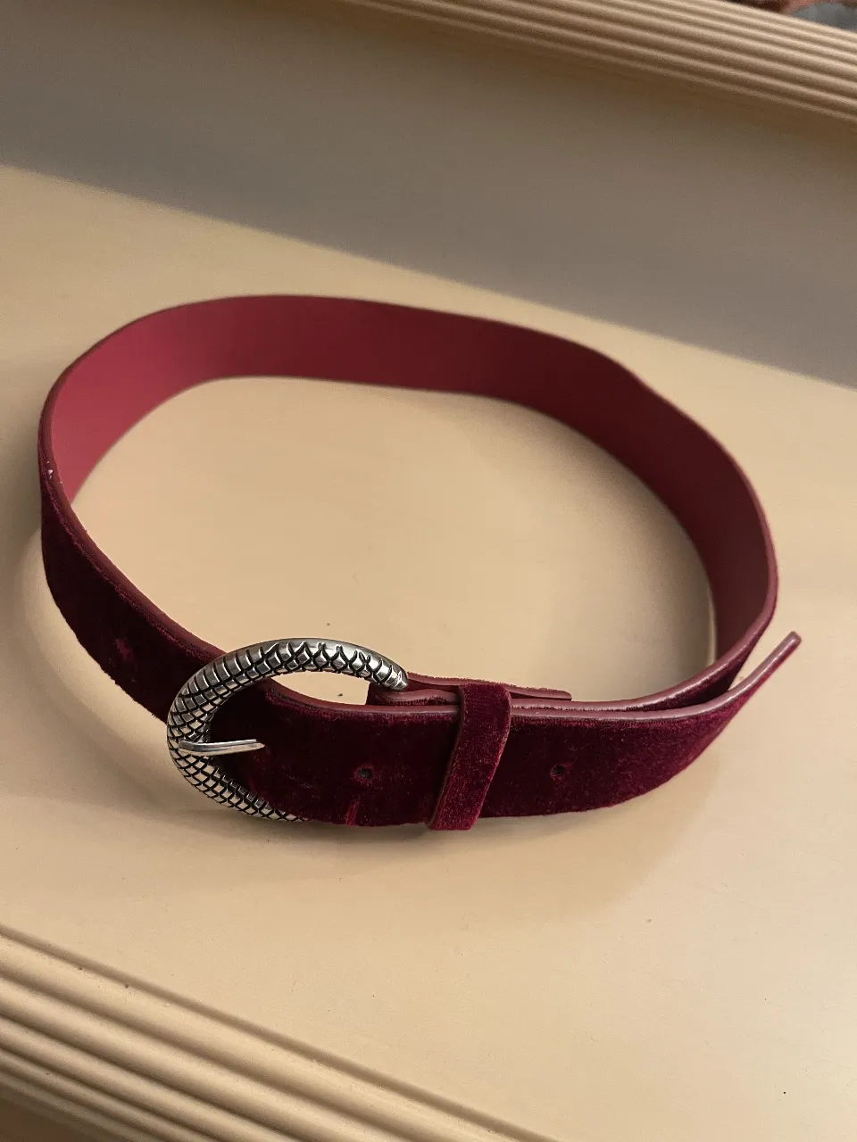 Cinturón de terciopelo bordo con hebilla plateada texturizada. Un accesorio ideal para realzar cualquier outfit. Medidas ancho 4 cm, largo 95 cm