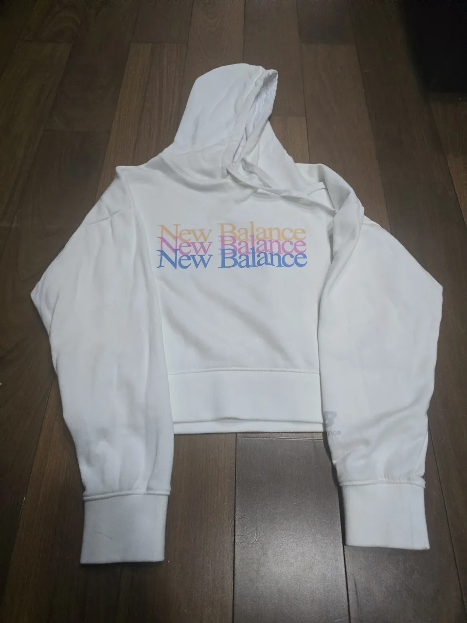 Buzo blanco con capucha y estampa "New Balance" en degradé de colores pastel en el frente. Hecho en Argentina.