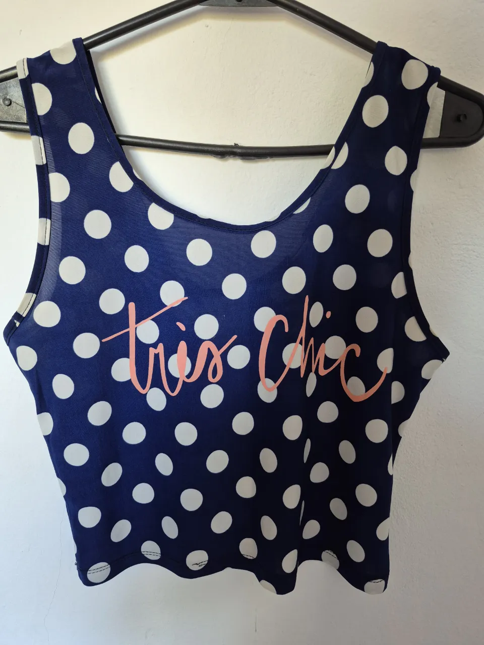 Musculosa azul con lunares blancos y estampa "tres Chic" en coral. Posee una tira central con lentejuelas plateadas.