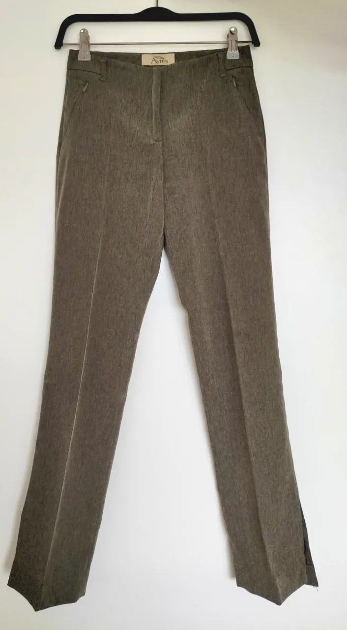 Pantalón sastrero color verde oliva y brillo dorado sin estridencias. Bolsillos laterales con cierre. Posee presillas para cinturón y detalle de tajo lateral de 15 cm en la botamanga. Tiro alto. Talla pequeño. Cintura: 66cm Largo total 96cm. Elegante, casual, arreglado y diurno. Cualquier consulta no dudes en preguntar.