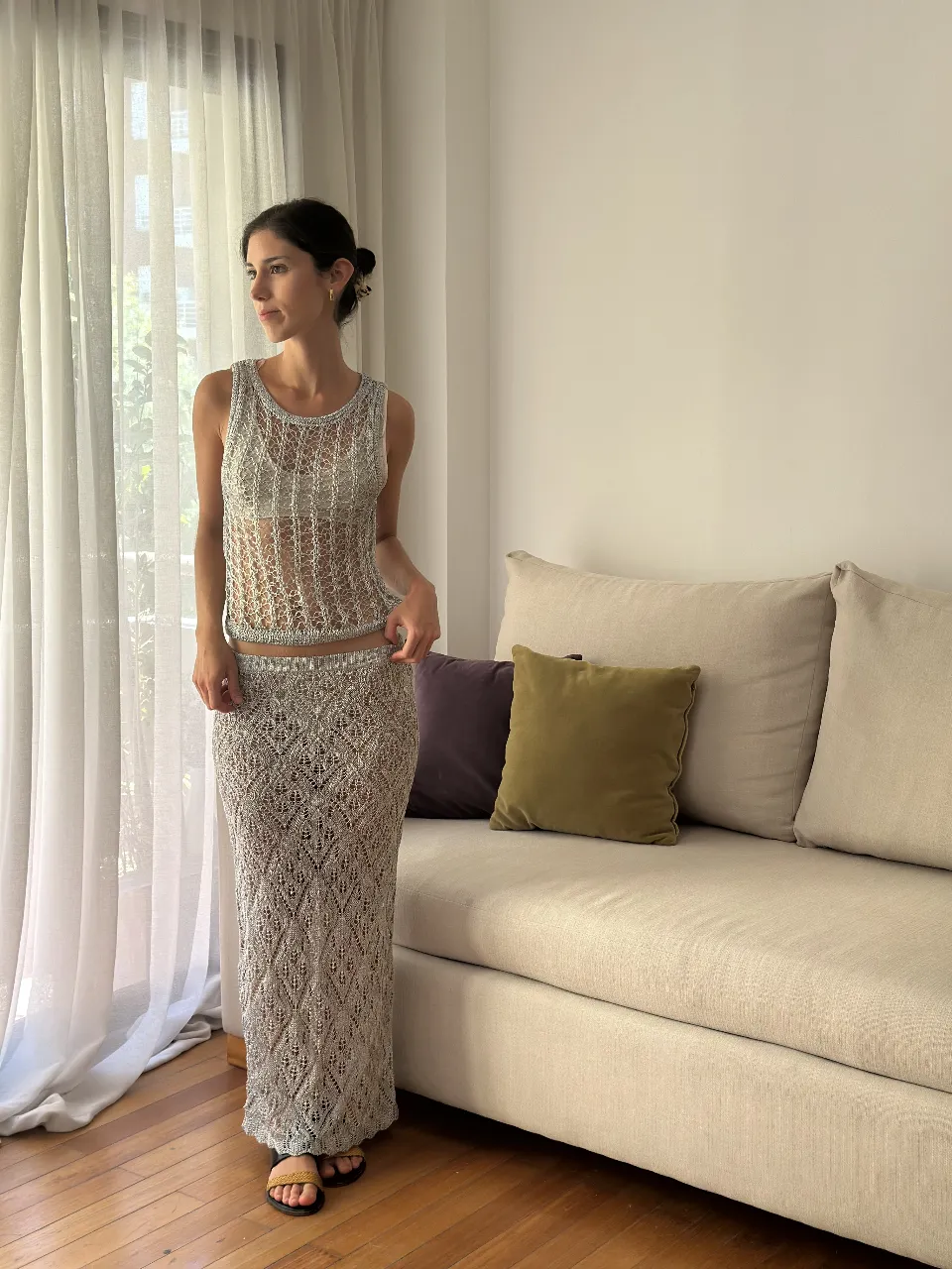 Conjunto sin uso y con etiqueta (Zara), tejido de dos piezas, top y pollera larga, ideal para un look playero o de verano. El tejido calado le da un toque bohemio y fresco. (las prendas se venden juntas o por separado).