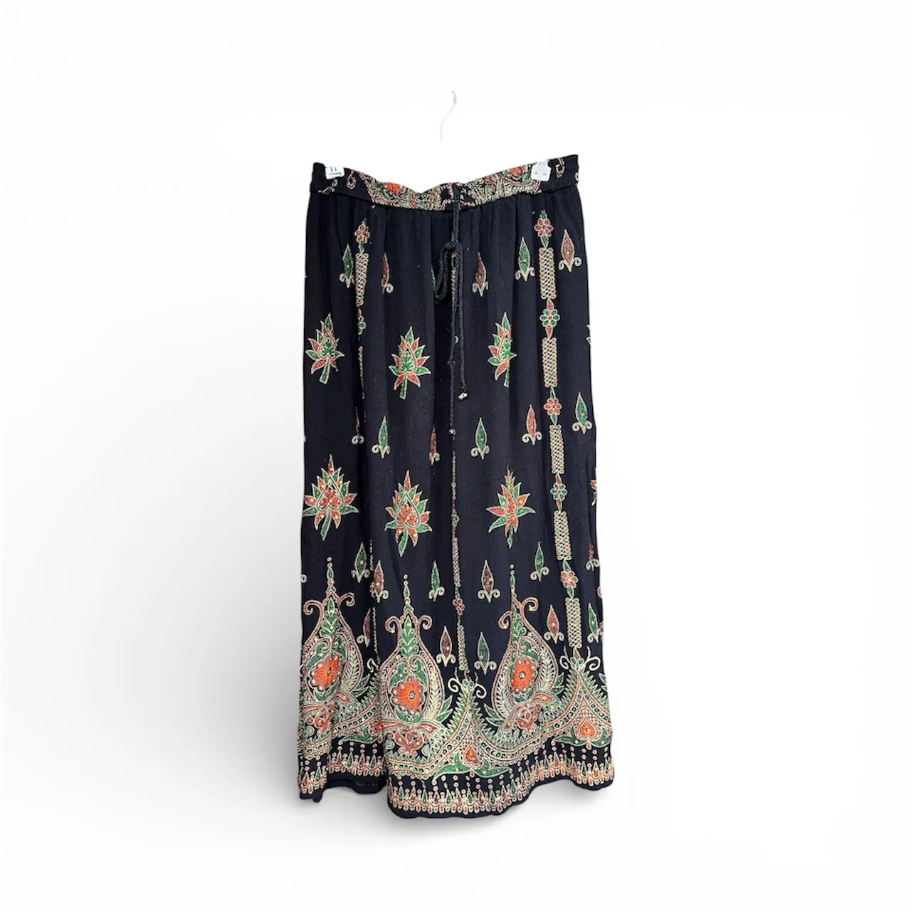 Pollera larga estampada con detalles bordados y brillos. Diseño boho chic, ideal para un look relajado y con estilo. Cintura ajustable con cordón.