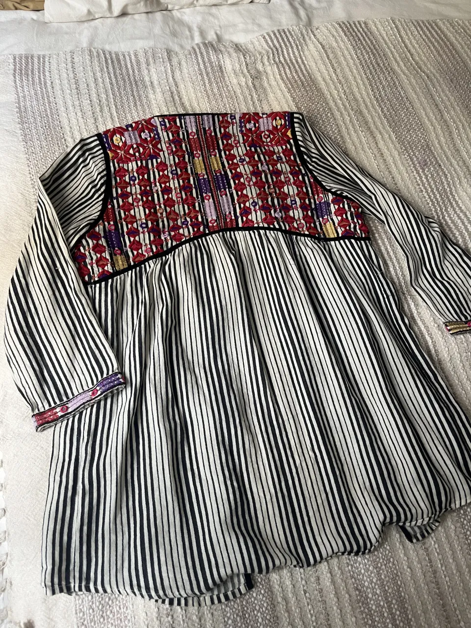 Blusa de mangas largas a rayas blancas y negras. Posee un bordado colorido en la parte superior delantera y en los puños. Se ata con tiras finas en la parte delantera.