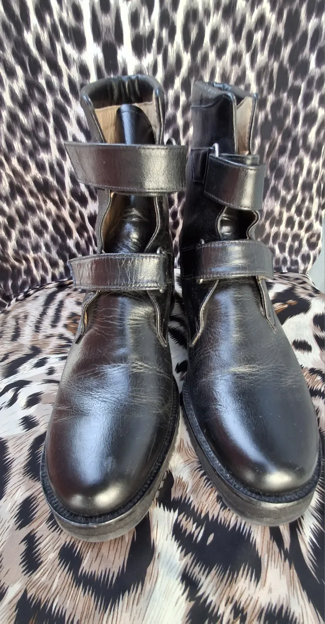 Botas de cuero negras con dos abrojos en cada una. Caña corta.