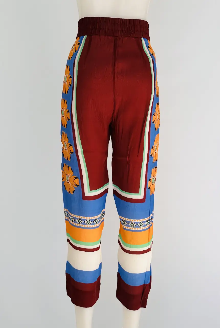 Pantalón suelto de mujer con estampado floral y detalles geométricos. Diseño con cintura elastizada y corte holgado, ideal para un look casual y cómodo.