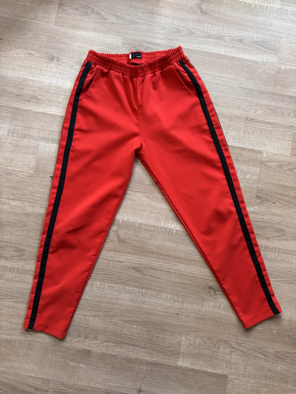 Pantalón de vestir rojo con franjas negras a los costados. Cintura elastizada para mayor comodidad. Tiro: alto