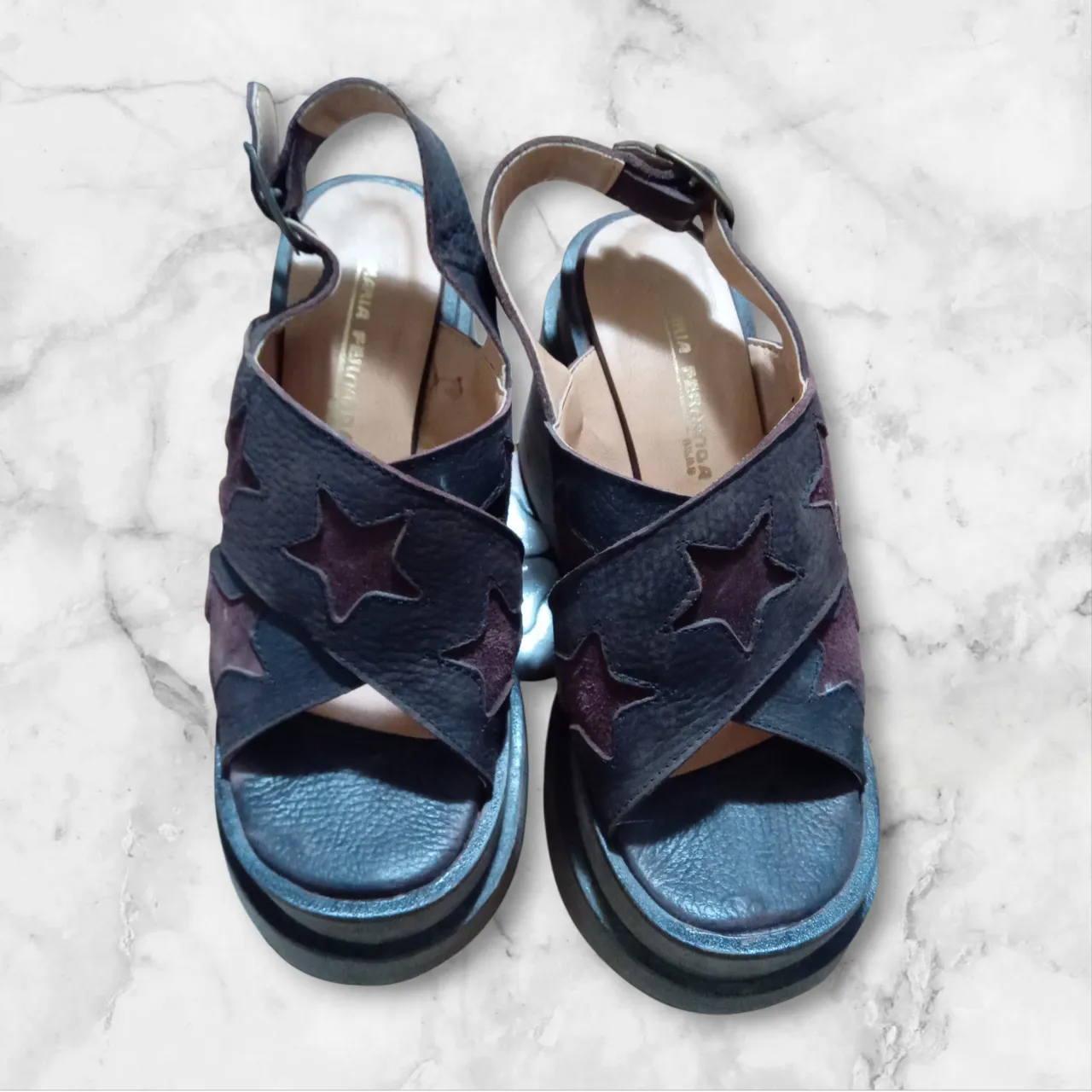 Sandalias con plataforma y estrellas. Tienen tiras cruzadas al frente y hebilla en el talón.