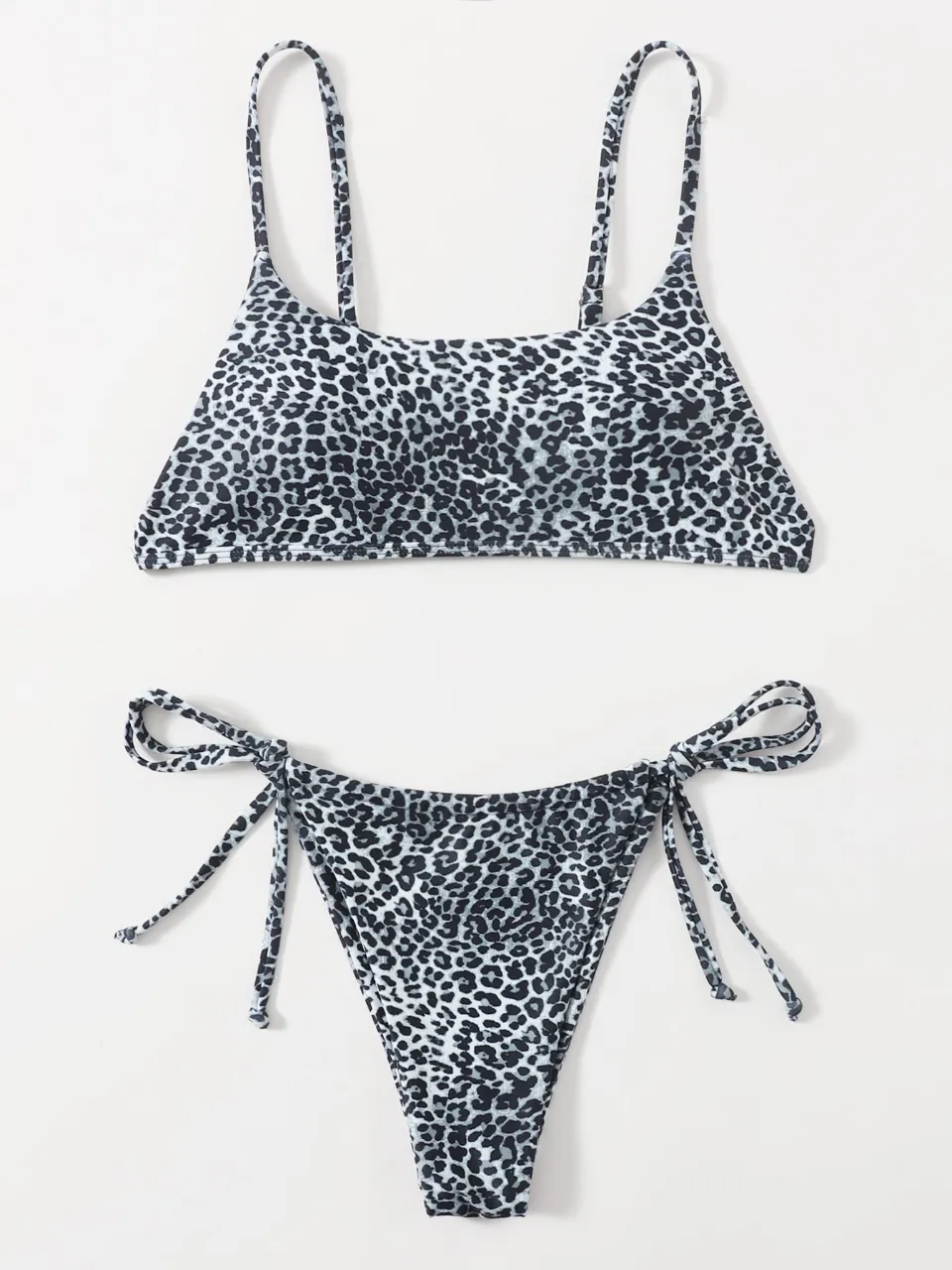 Bikini estampada con motivo de leopardo en blanco y negro. La parte superior es un top con breteles finos regulables y tazas desmontables y la parte inferior tiene tiras laterales para atar.