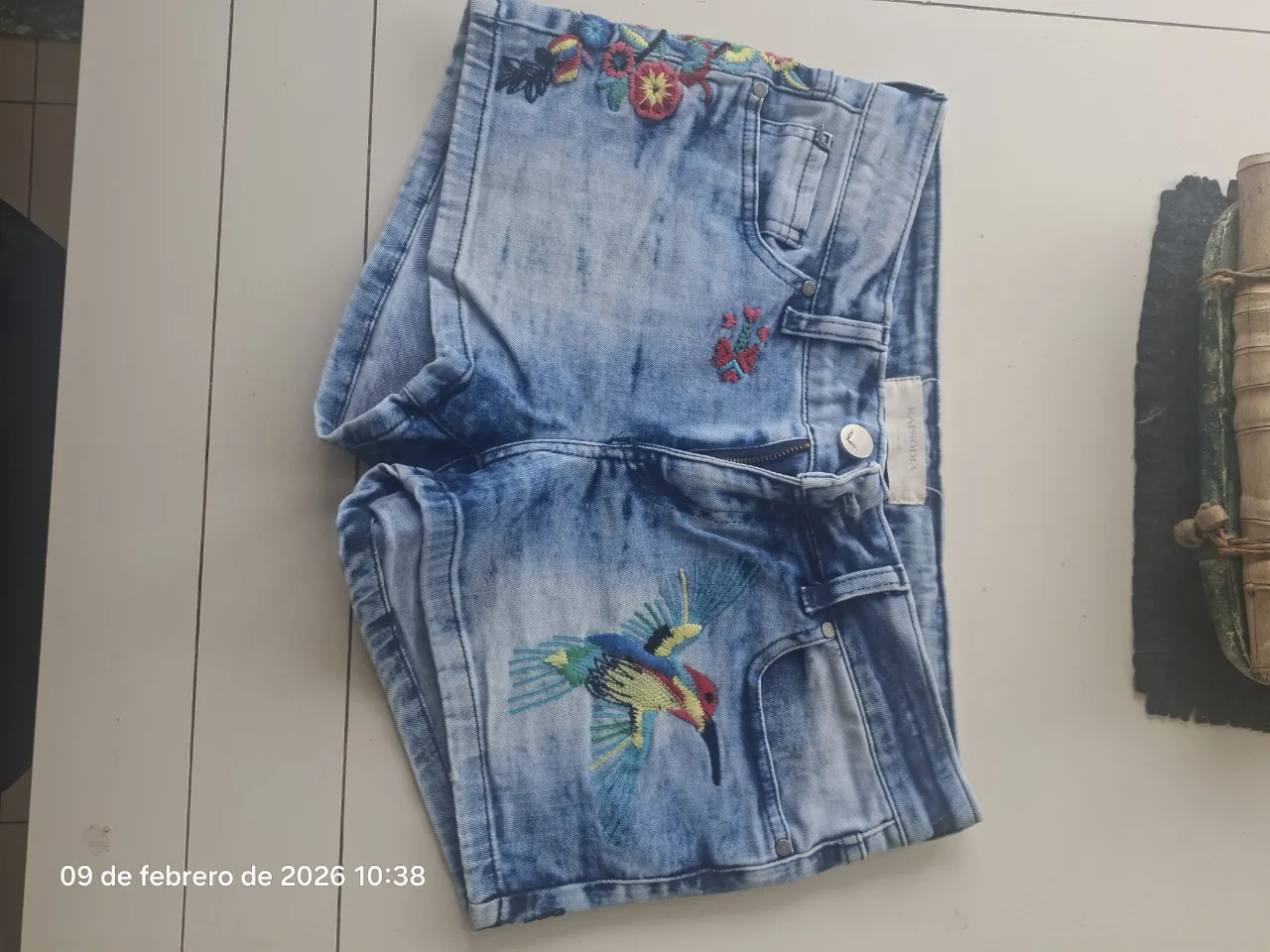 Shorts de jean Rapsodia, con bordados coloridos de flores y un colibrí. Hermoso. 40 cm de cintura lineal