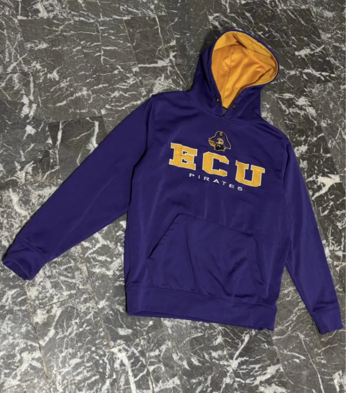 Buzo con capucha morado de los ECU Pirates. Ideal para fanáticos del equipo o para un look casual y deportivo. Tiene bolsillo canguro al frente y el interior de la capucha es de color amarillo vibrante.