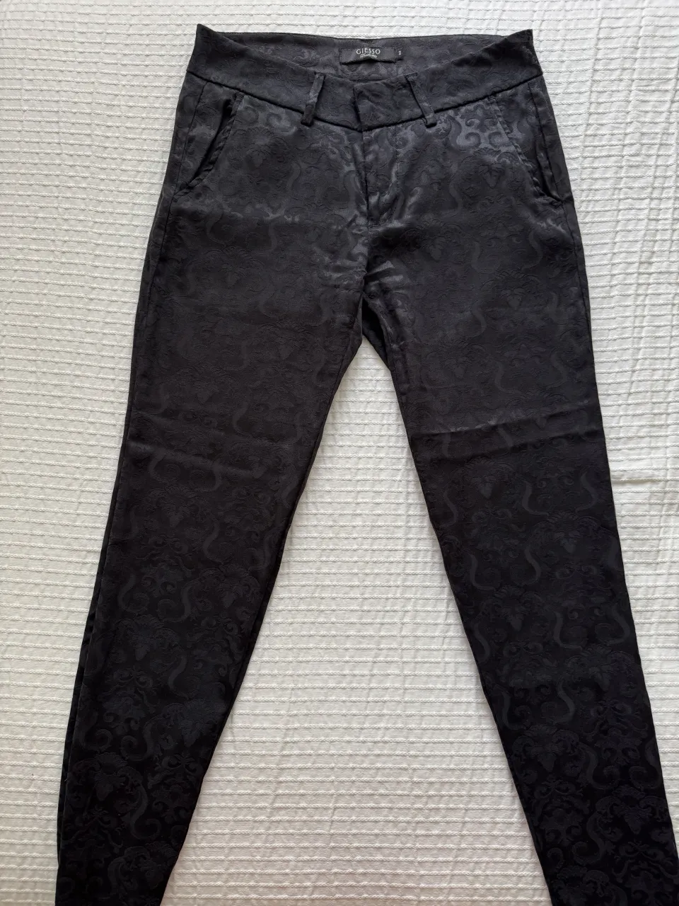 Pantalón negro con estampado floral en relieve. Posee bolsillos delanteros y traseros.