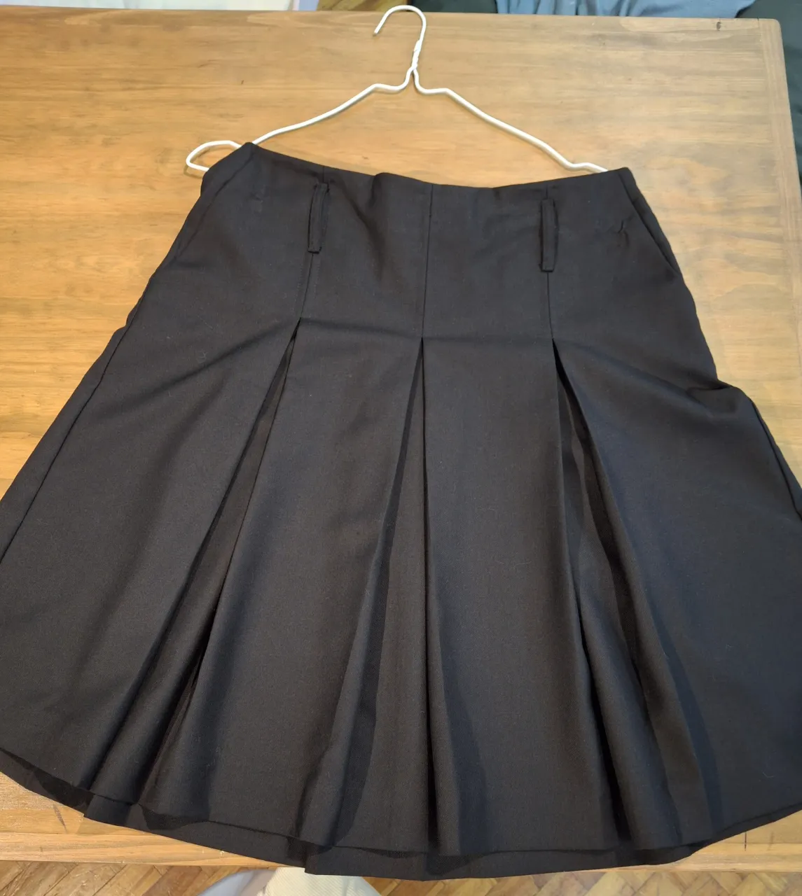 Pollera negra de vestir, con tablas al frente y bolsillos. Ideal para un look formal o canchero.